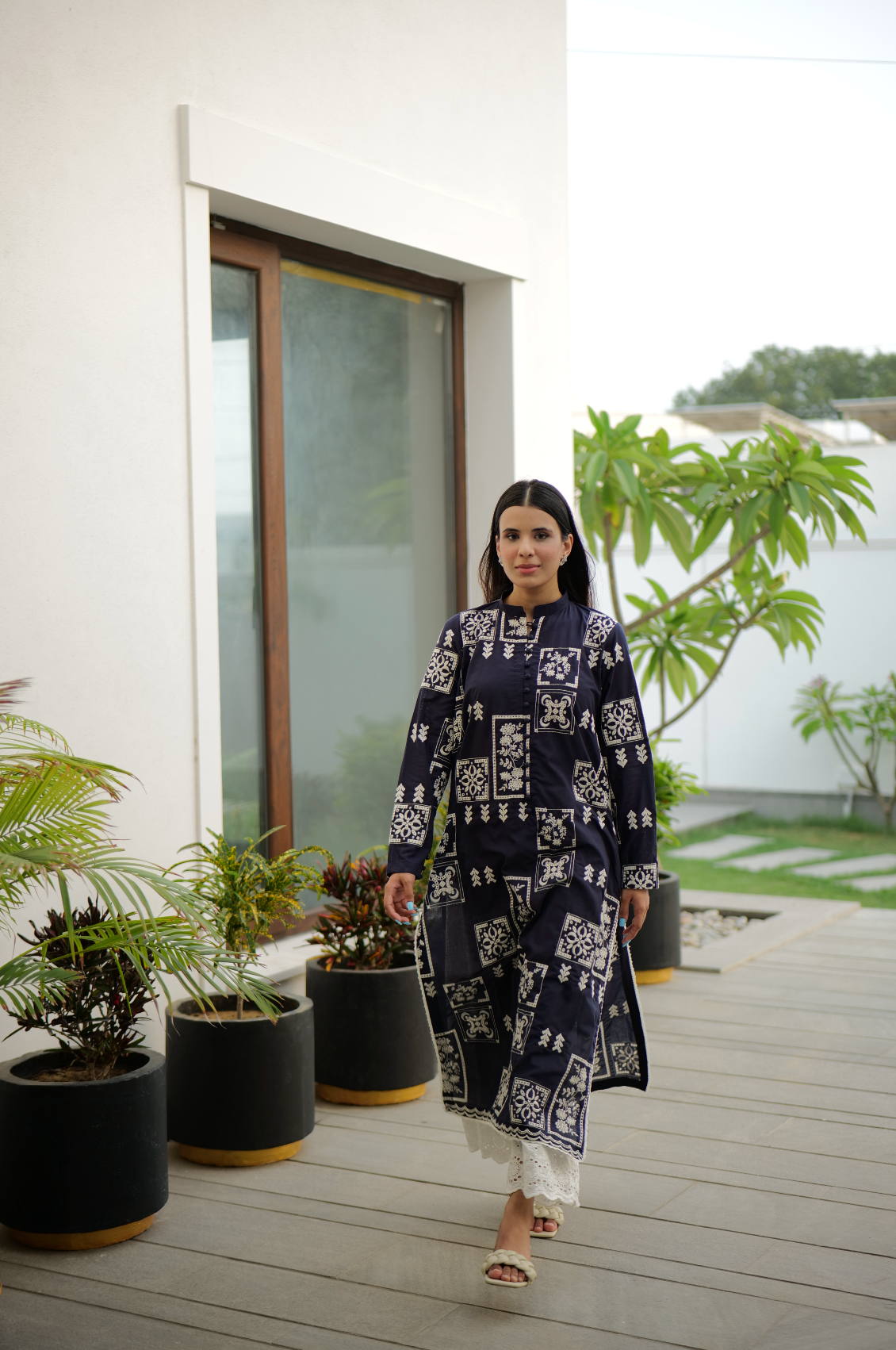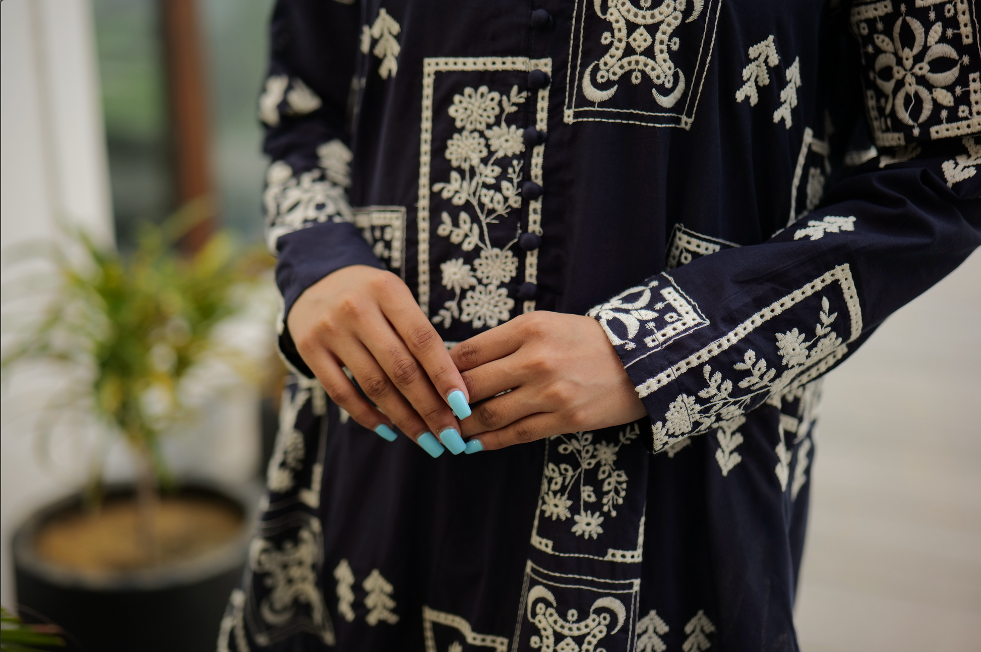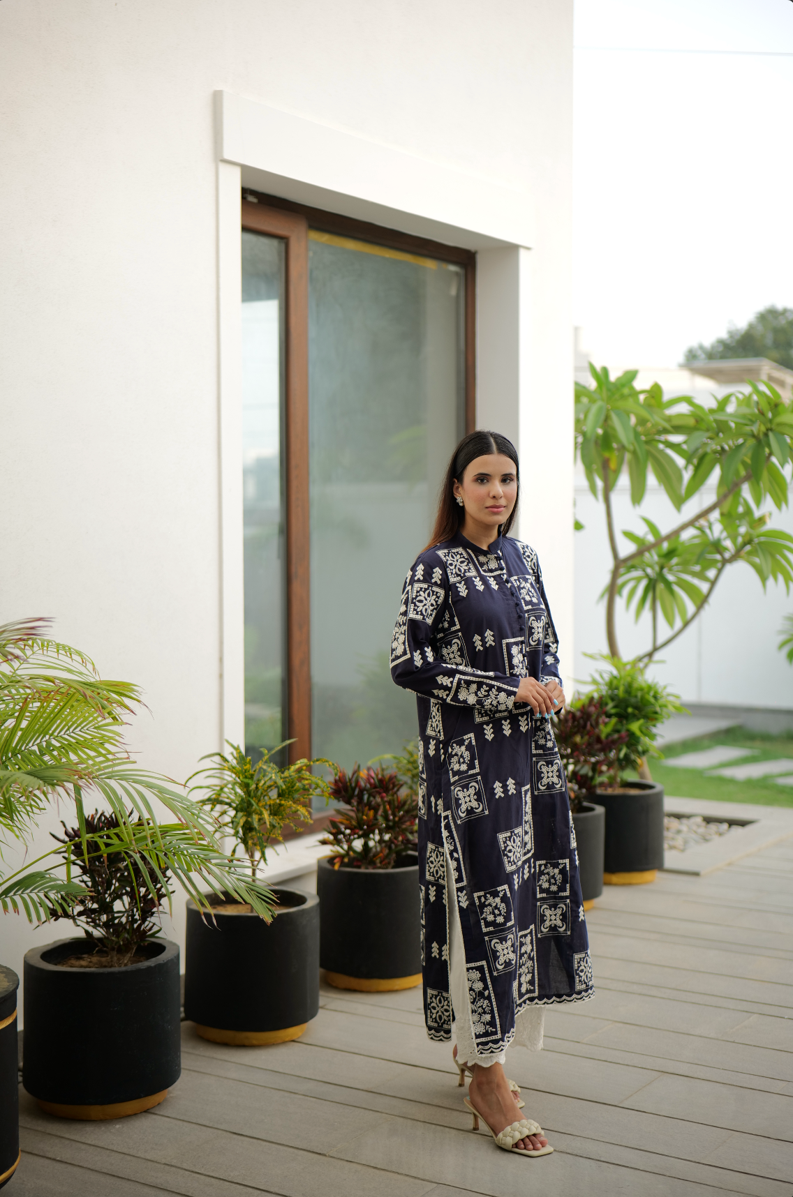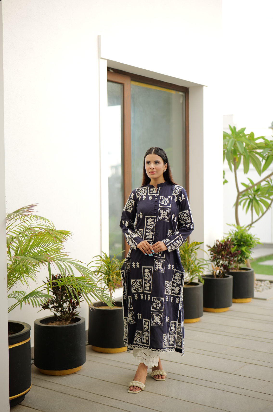 This exquisite blue kurta features Bareeze lawn material, adorned with intricate embroidery. The delicate craftsmanship and premium fabric ensure both elegance and comfort, making it a perfect choice for any occasion.