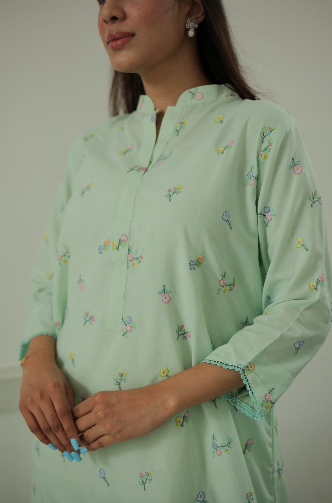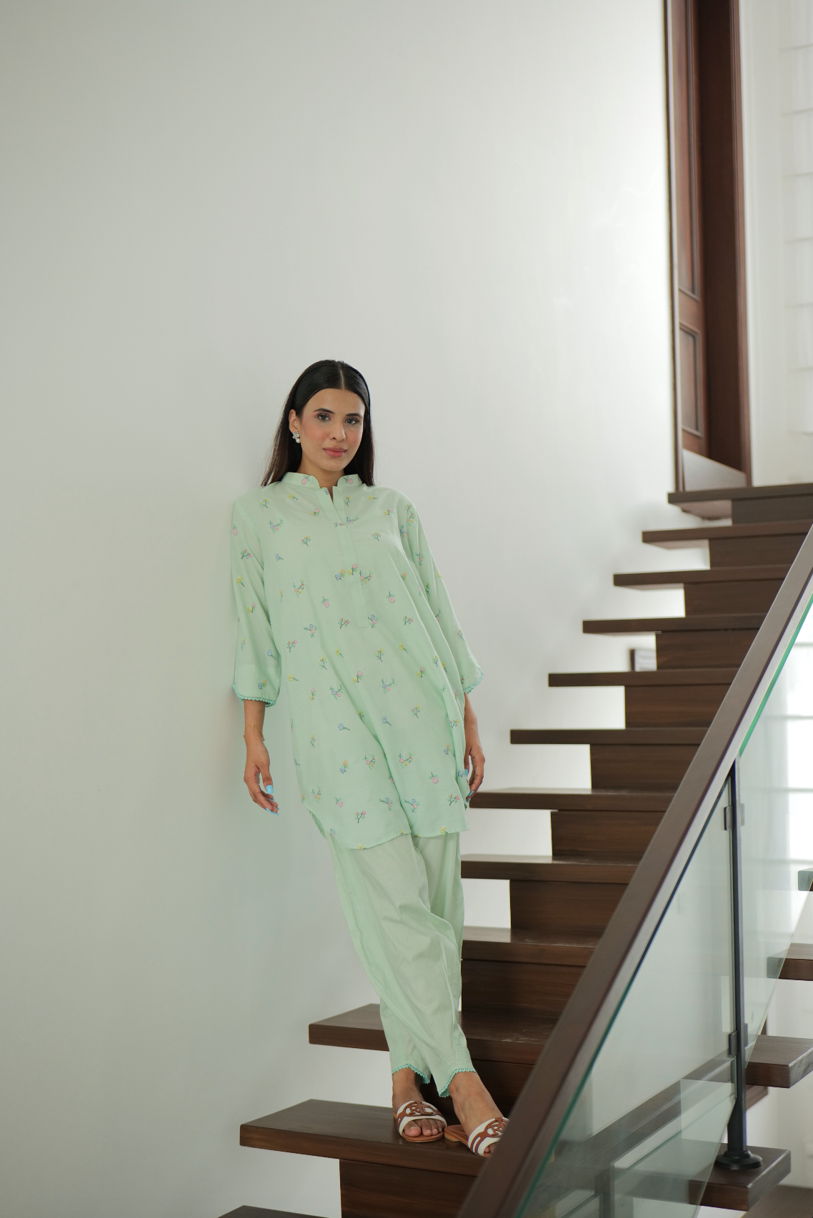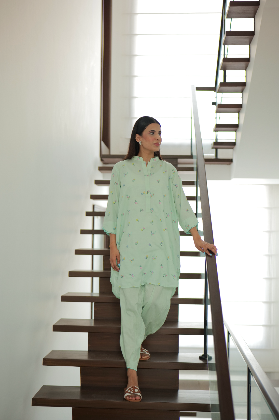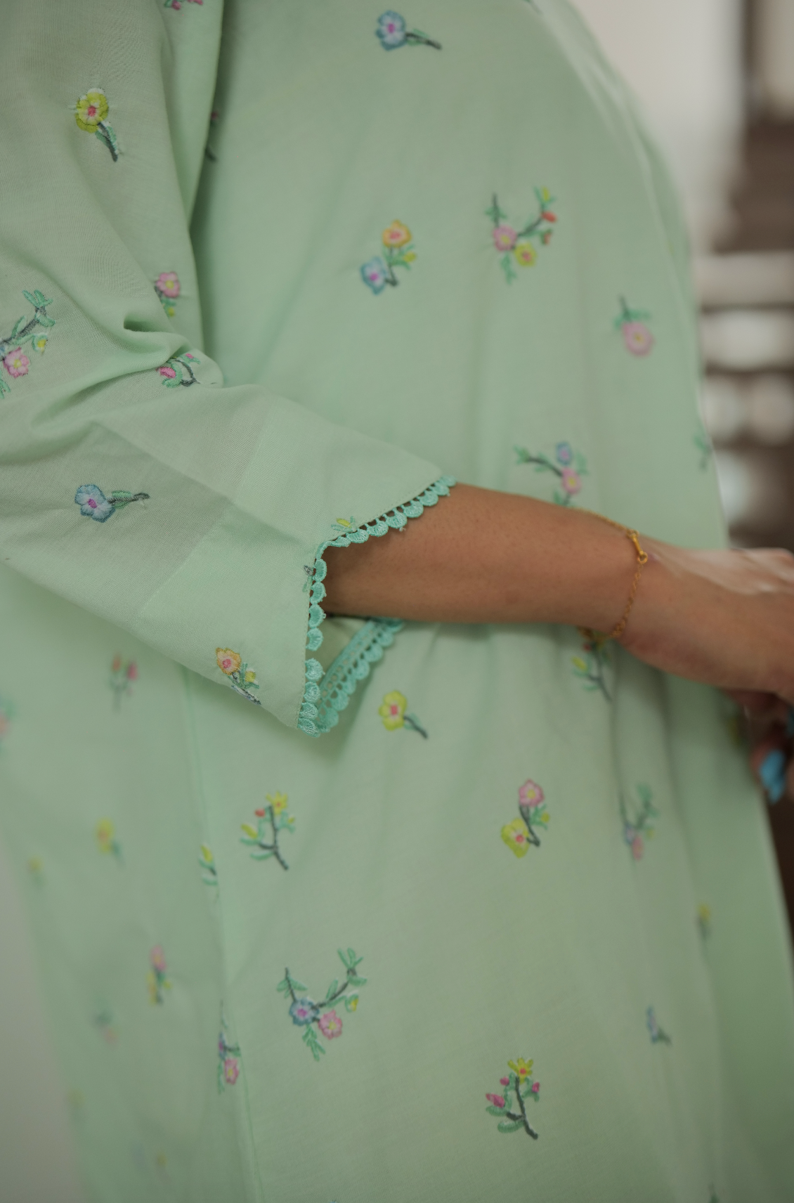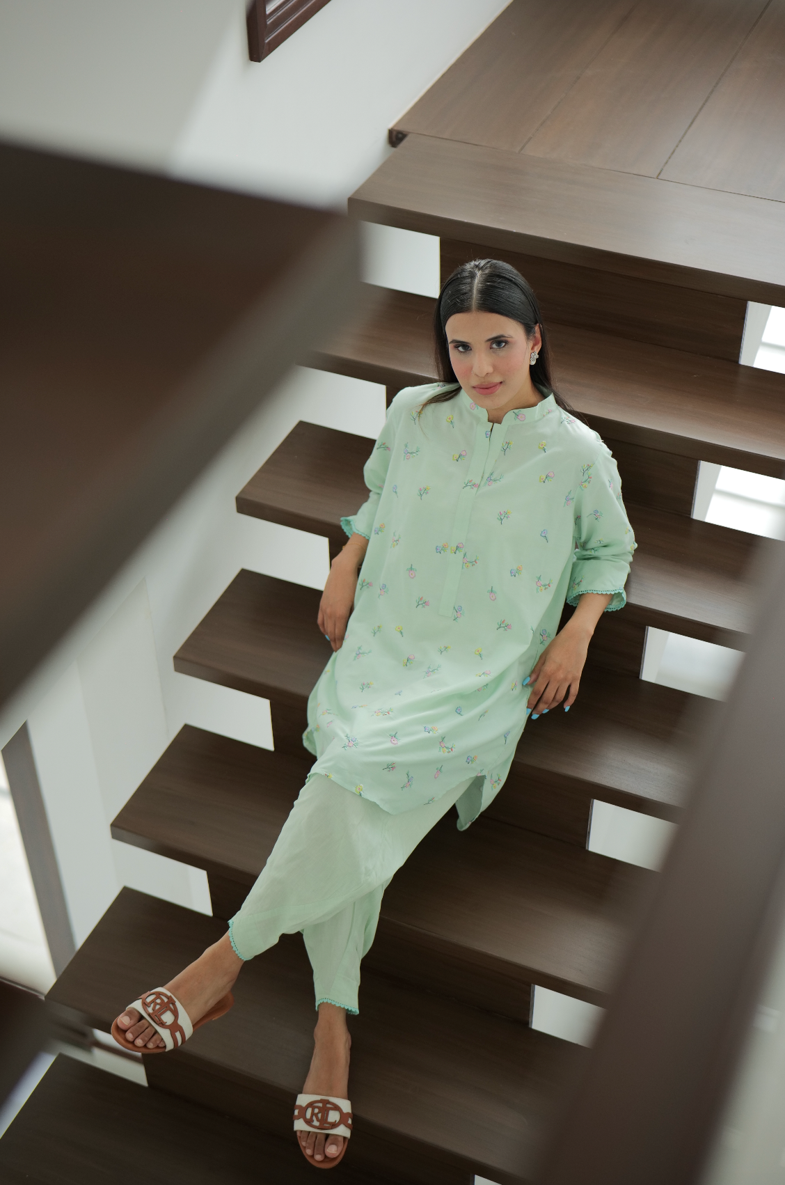 This chic 2-piece ensemble features a beautifully embroidered green kurta paired with a matching shalwar, exuding elegance and sophistication.