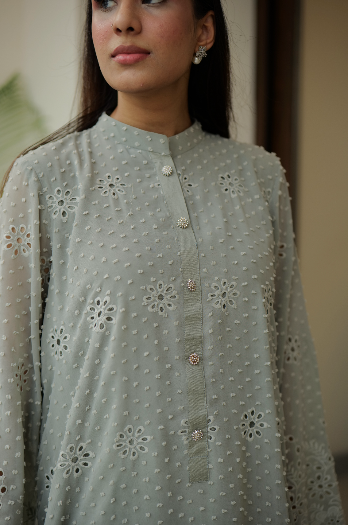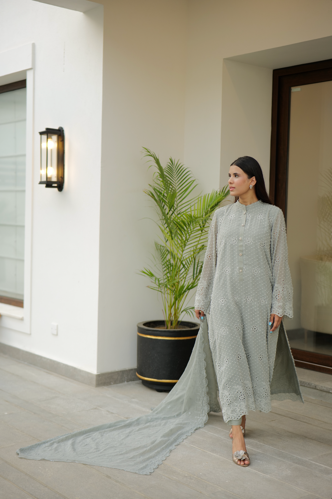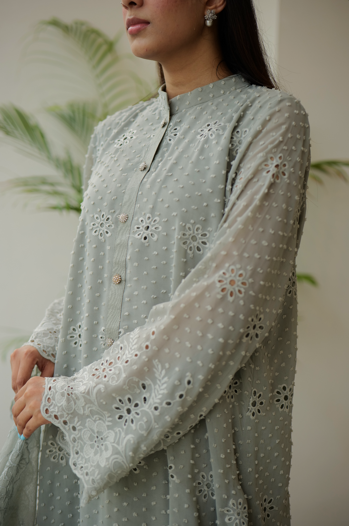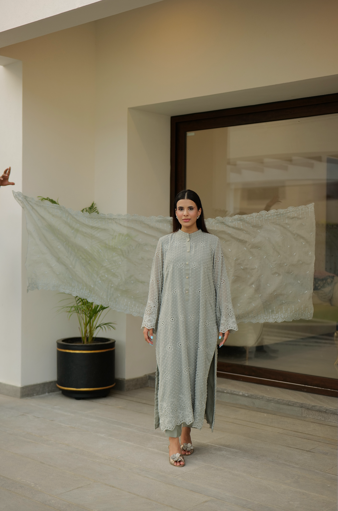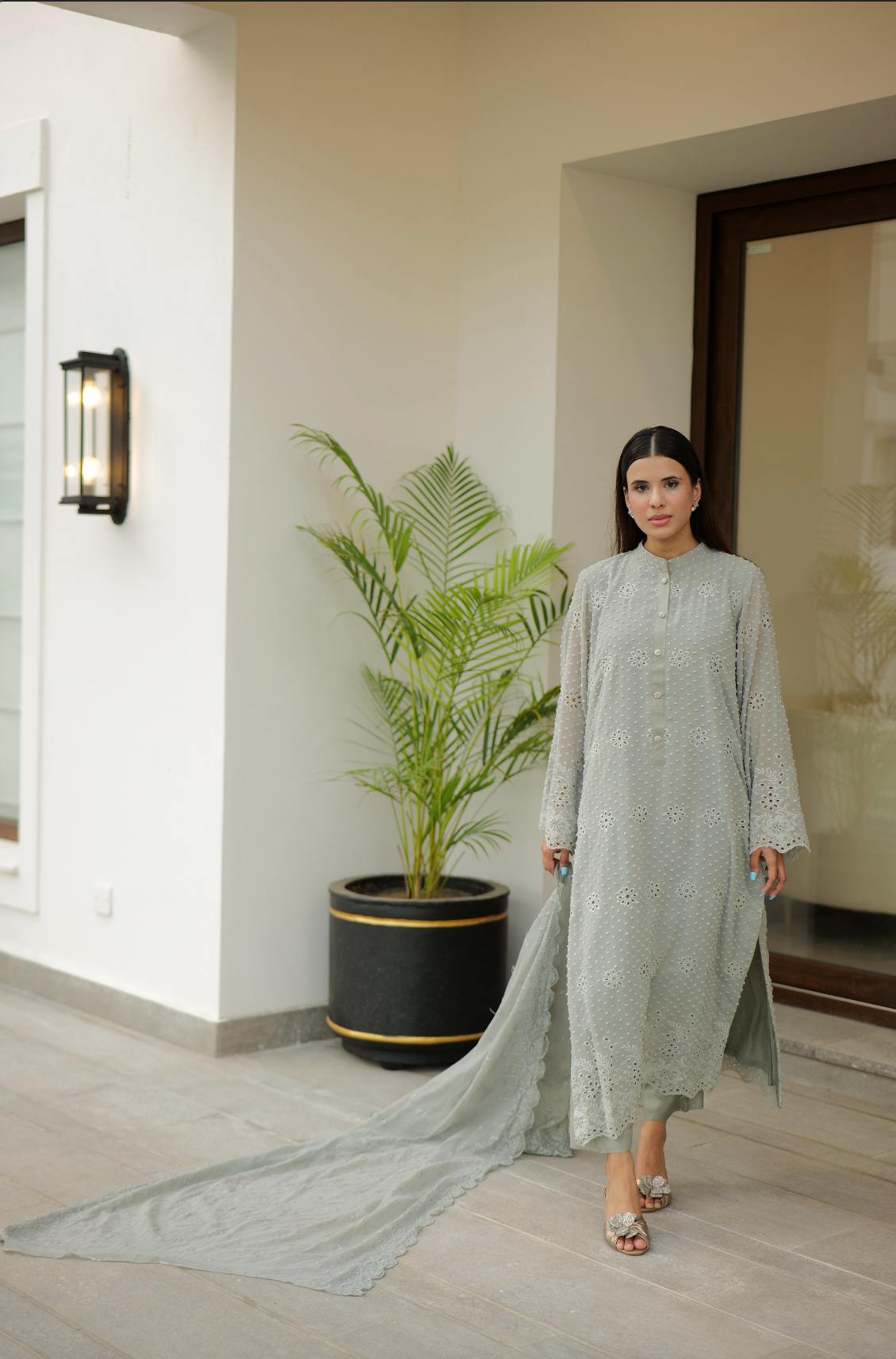 This elegant sage greenoutfit features luxurious brochia chiffon material, enhanced by a delicate cutwork with attached inner . Diamond button embellishments add a touch of sparkle, while the intricately embroidered dupatta completes the look with sophistication and style.