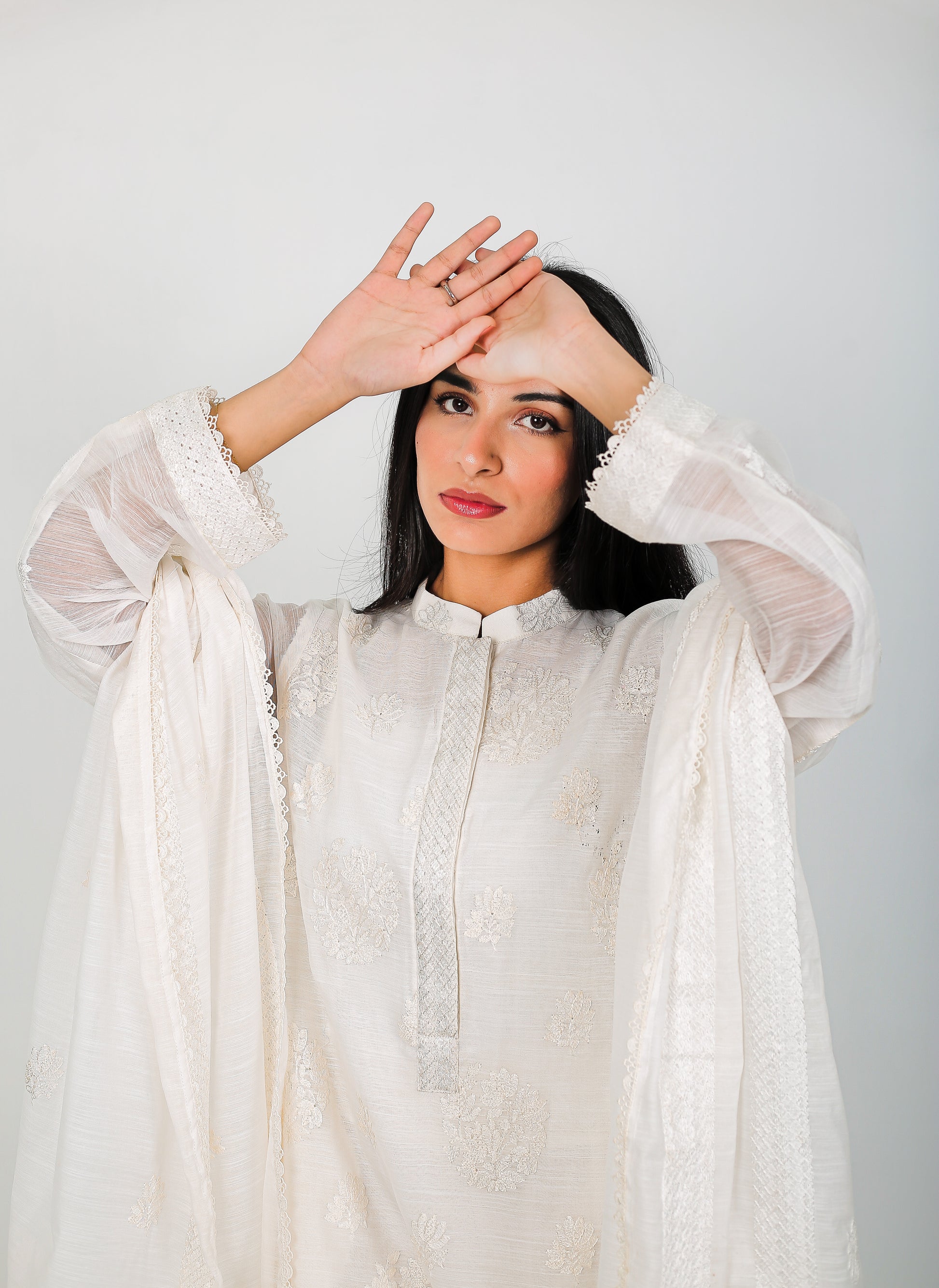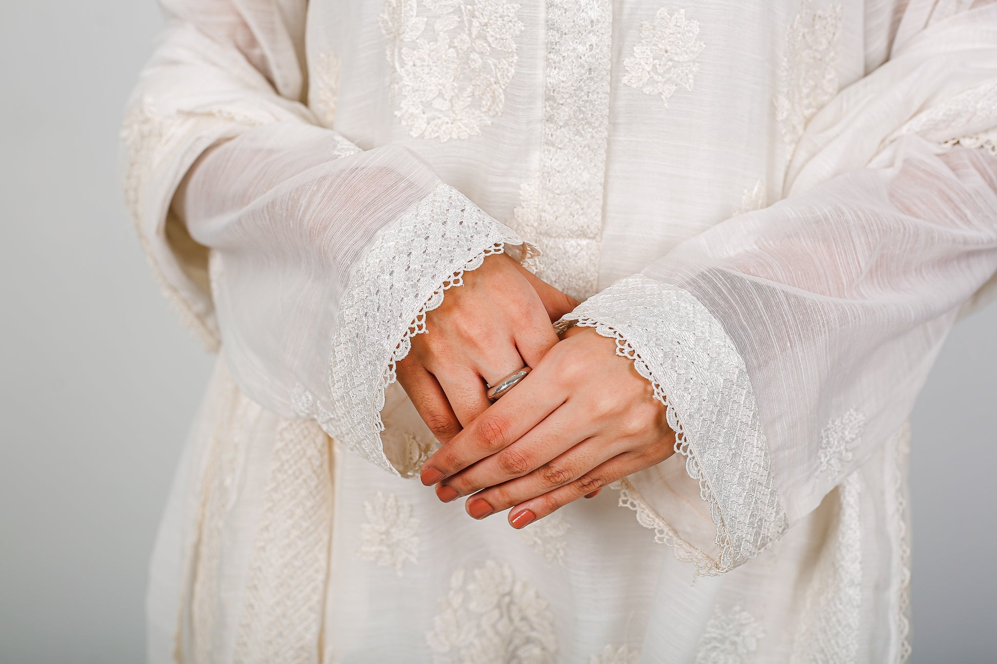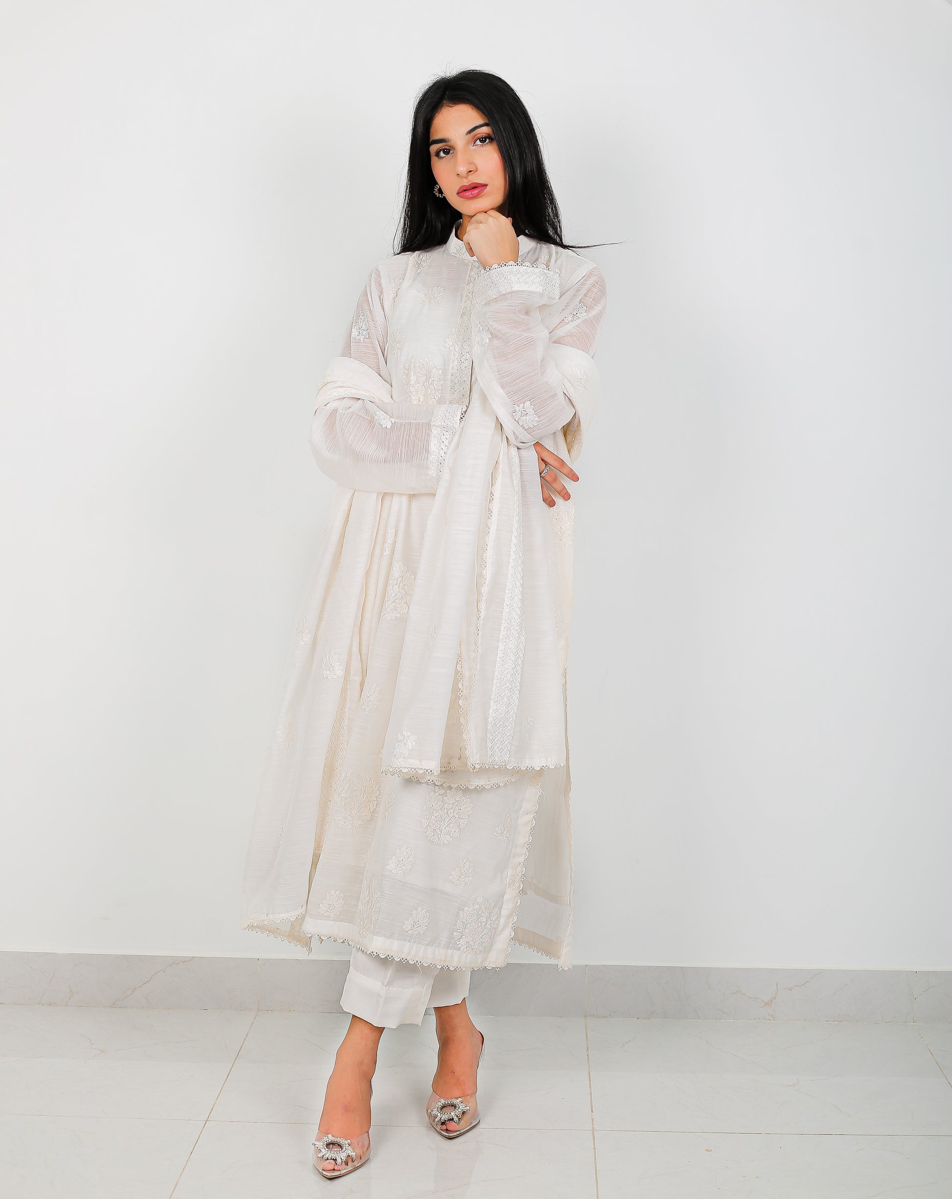 The Moonlit Elegance 3-piece set is a vision of purity and sophistication. Crafted from premium voile fabric, it features intricate all-over embroidery with an attached inner for a seamless finish. Paired with matching trousers and dupatta, this timeless white ensemble embodies grace and refinement — perfect for festive and formal occasions alike.