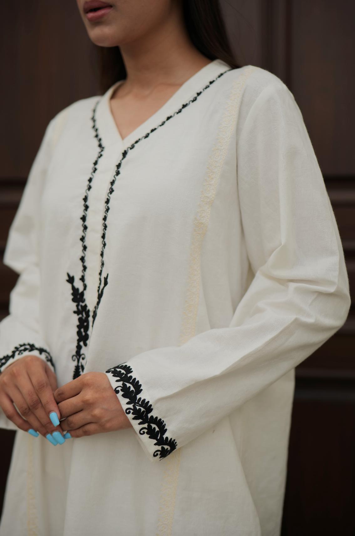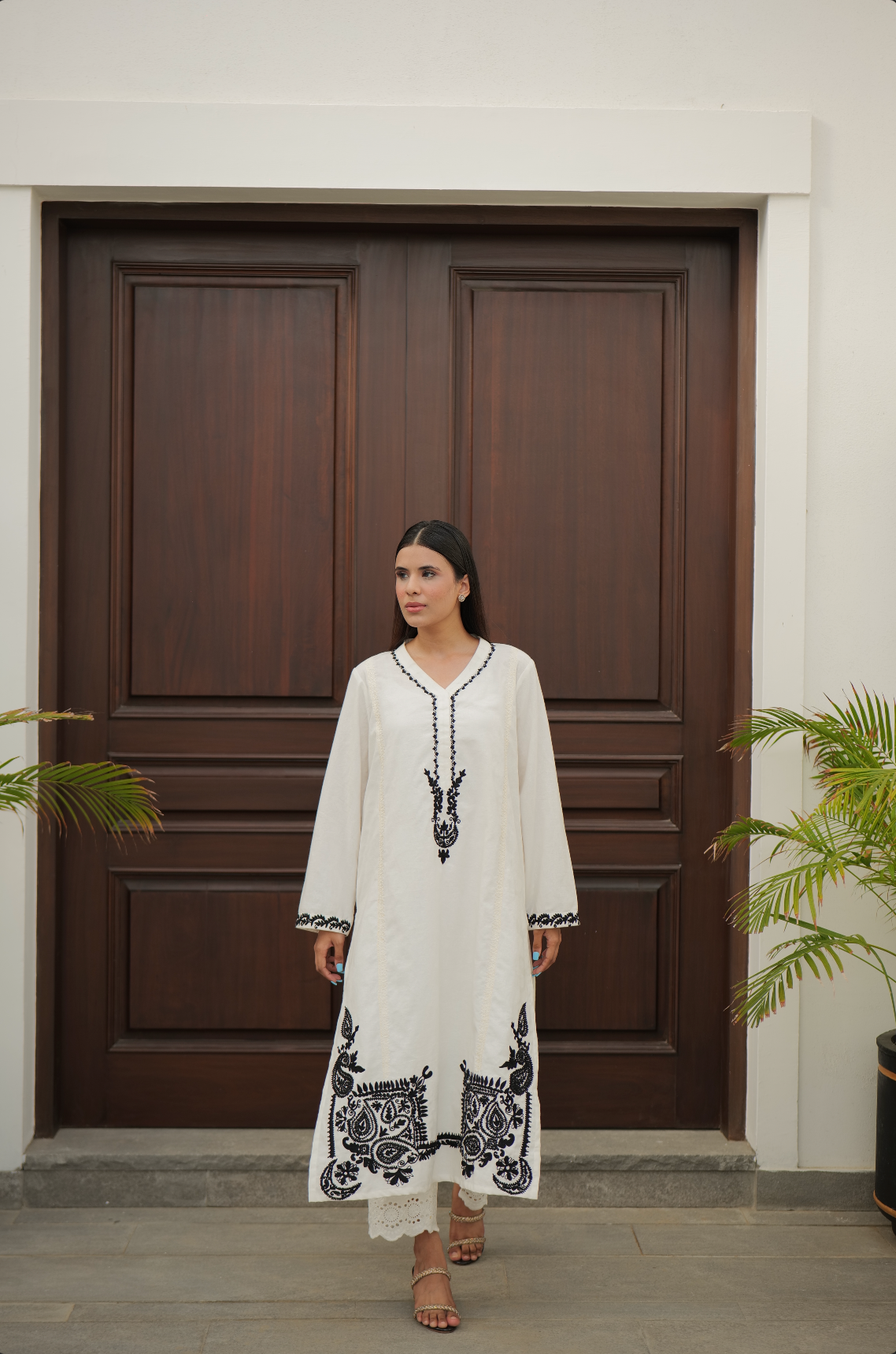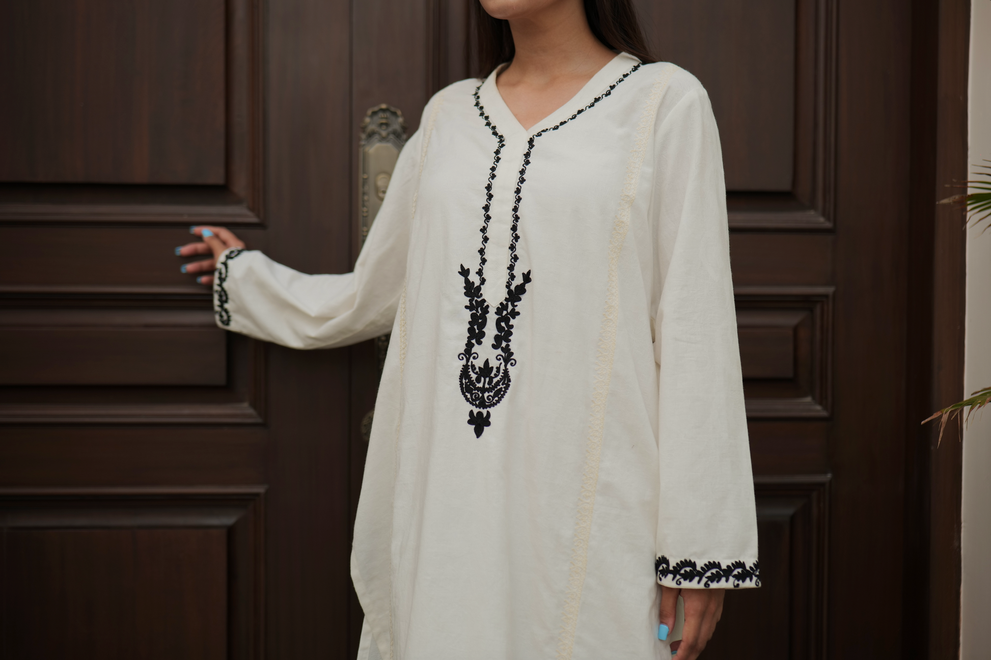 This striking outfit crafted from Bareeze cotton combines timeless black and white hues with intricate embroidery, epitomizing elegance and sophistication.