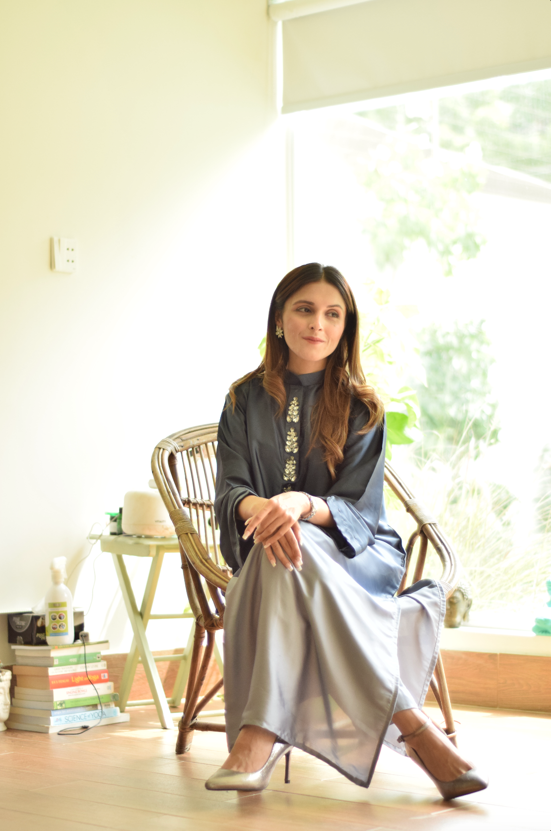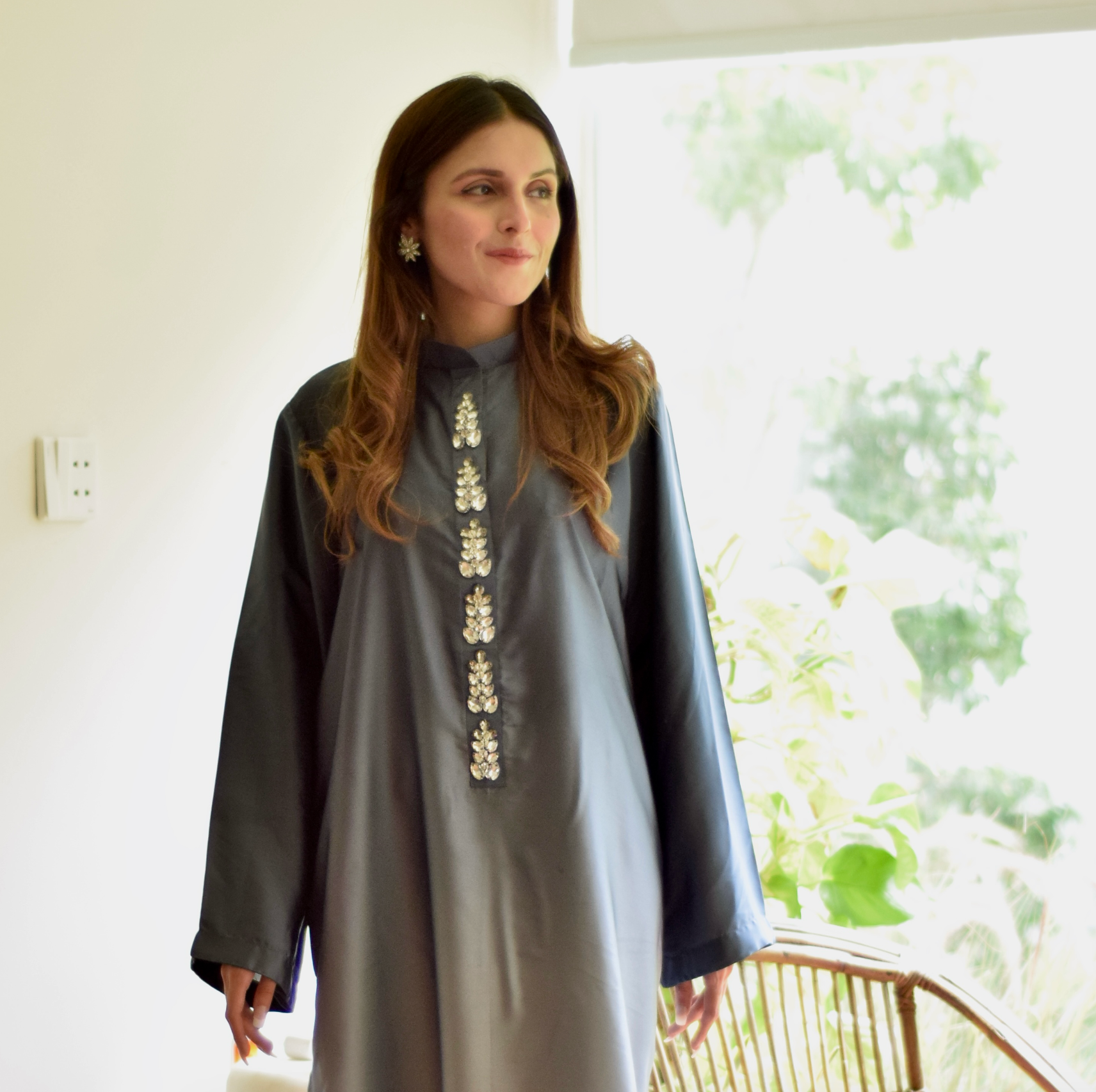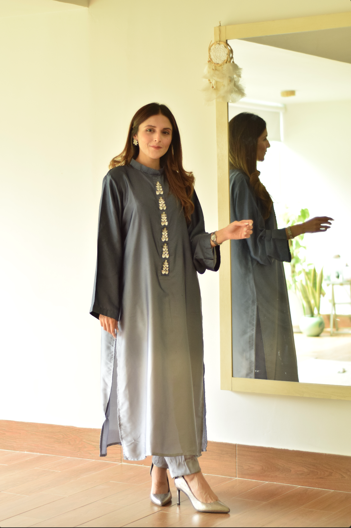 Step into the world of regal elegance with this 2 piece shamoz silk ombré outfit adorned with intricate hand work with stones on neckline. This outfit is sure to turn heads