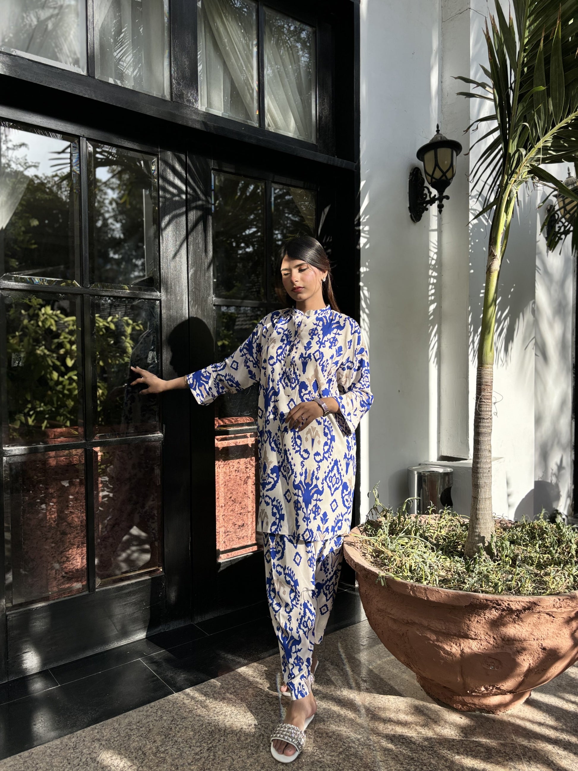 Effortless elegance in a breezy linen co-ord set. The relaxed silhouette and timeless blue-on-white print strike the perfect balance between comfort and contemporary style.