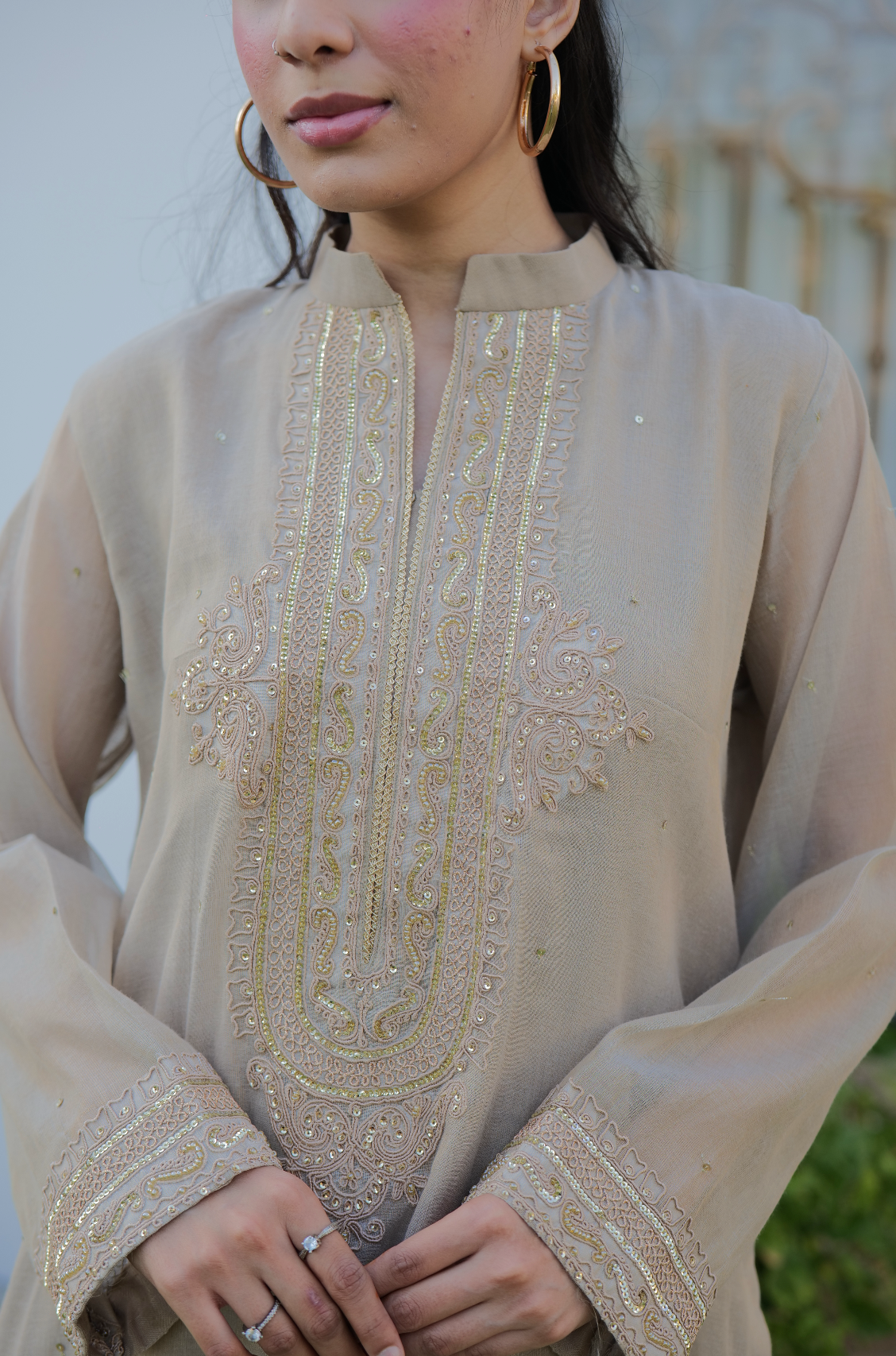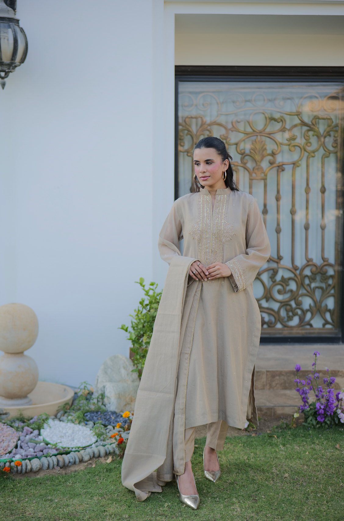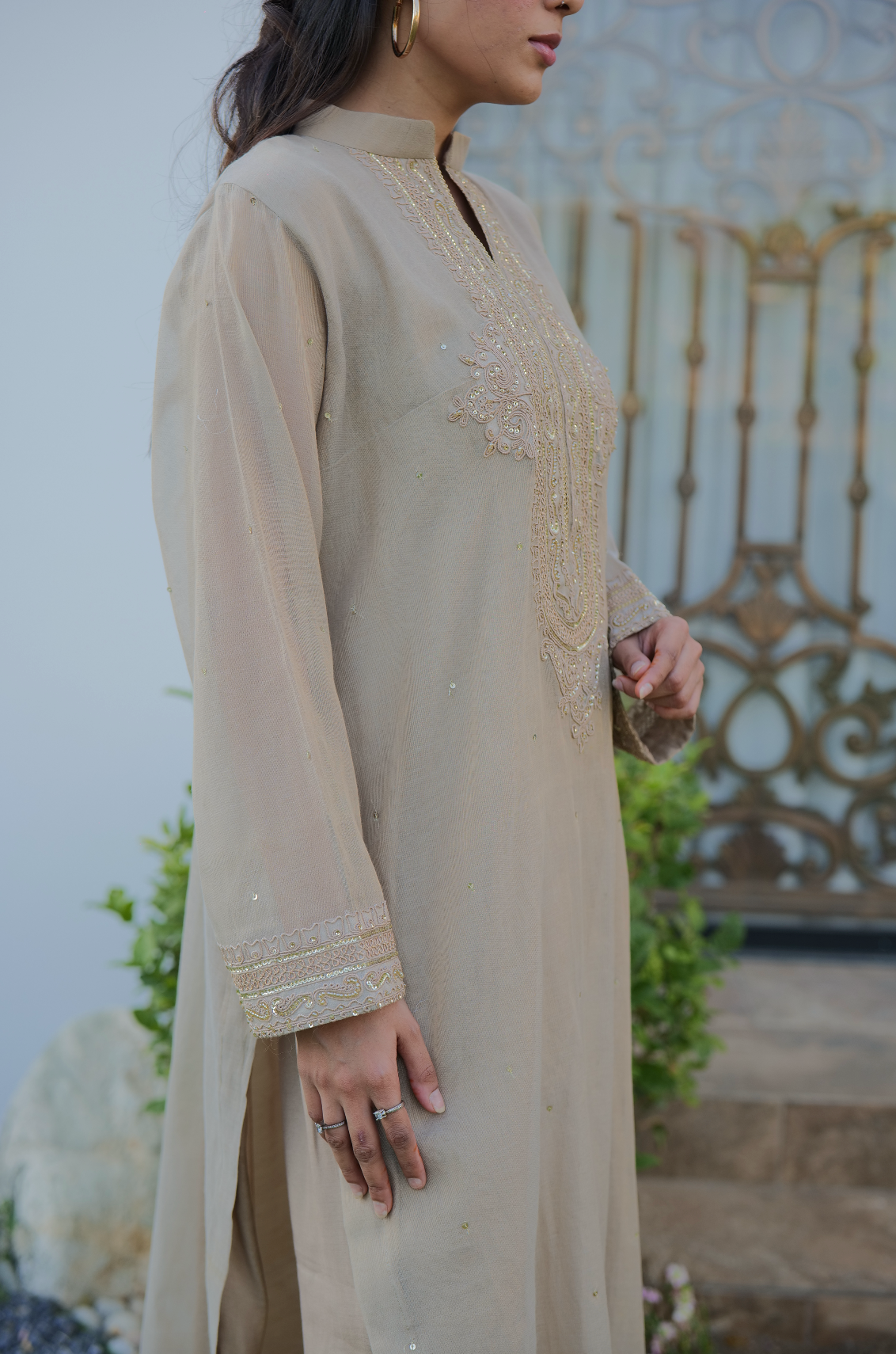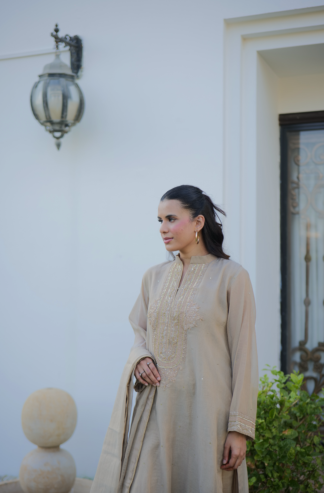 Draped in sophistication with this stunning beige ensemble: a Zari cotton kurta adorned with intricate tilla sequin work on the neckline and sleeves and sequence all over , paired flawlessly with matching trousers and a Zari cotton dupatta featuring delicate lace on all four sides.