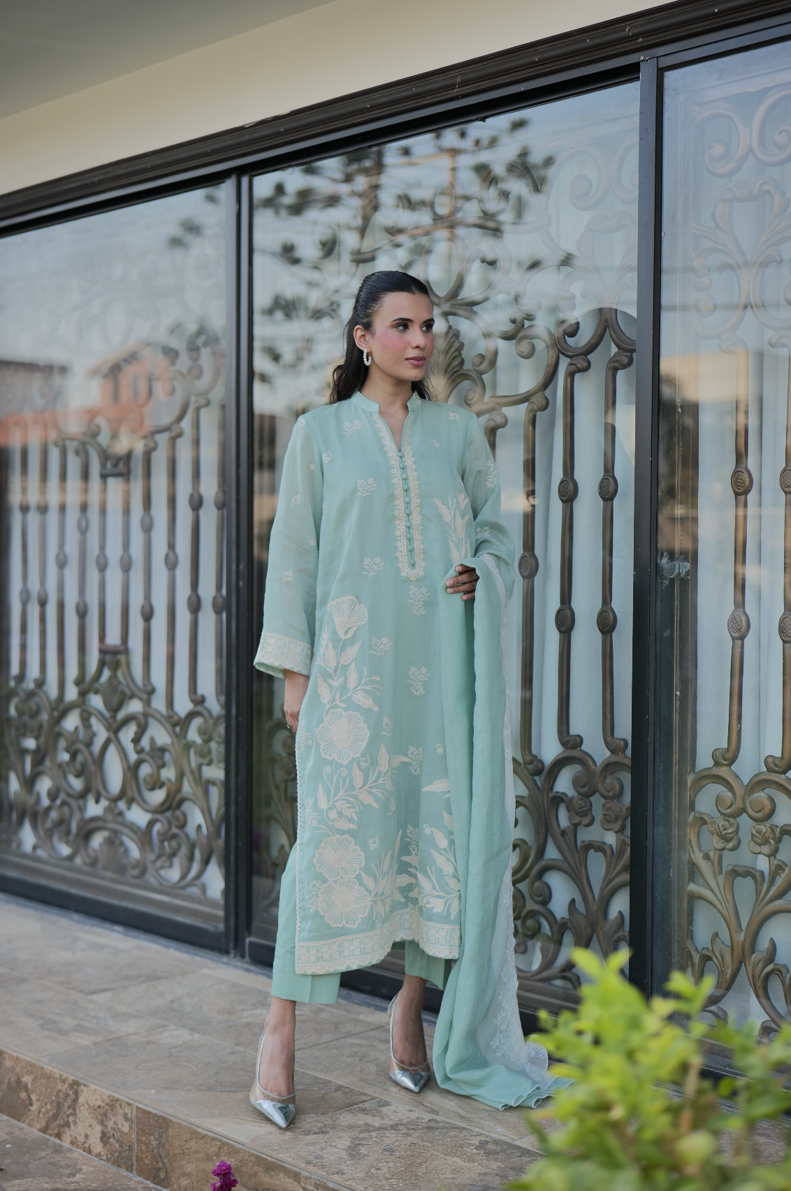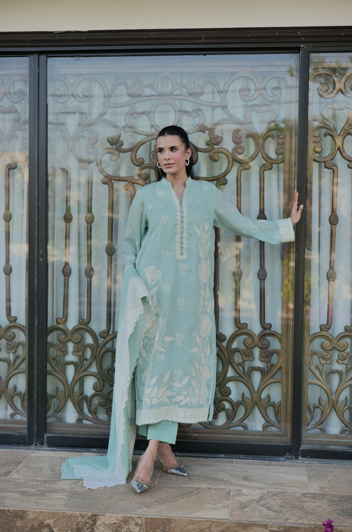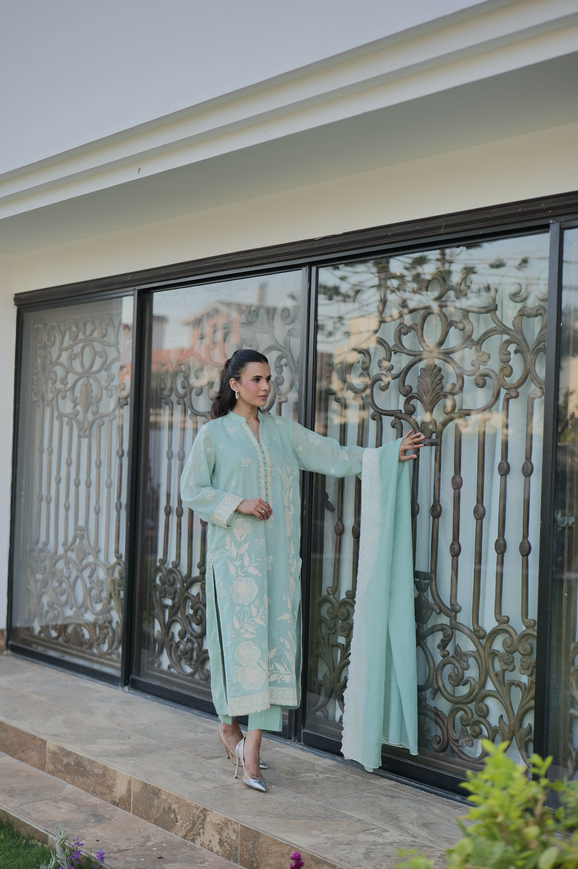 Radiate elegance in shades of green with this exquisite ensemble: a Bareeze lawn kurta intricately embroidered with aari work, paired with matching trousers and a stunning two-tone embroidered dupatta crafted from Khaadi net.