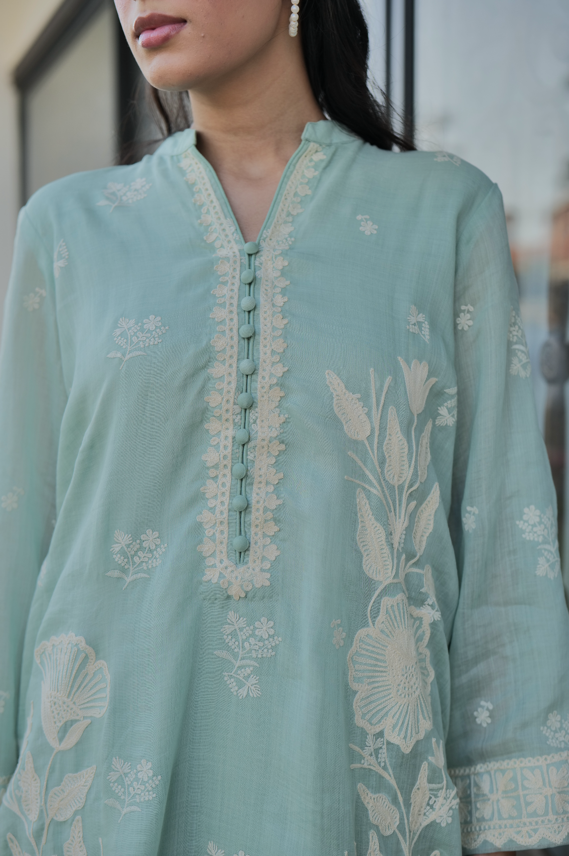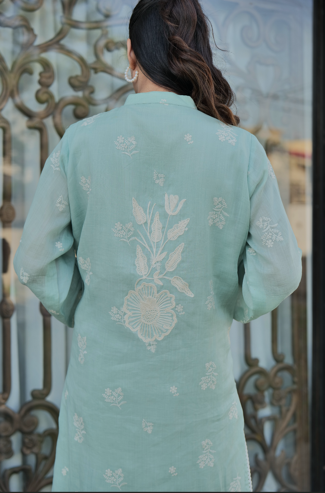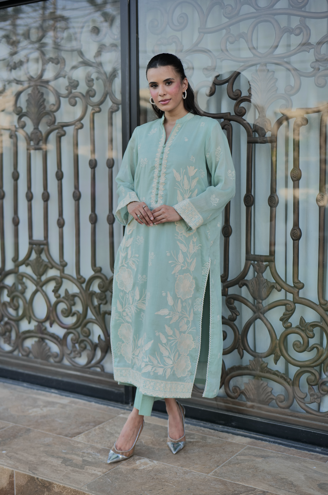 Radiate elegance in shades of green with this exquisite ensemble: a Bareeze lawn kurta intricately embroidered with aari work, paired with matching trousers and a stunning two-tone embroidered dupatta crafted from Khaadi net.