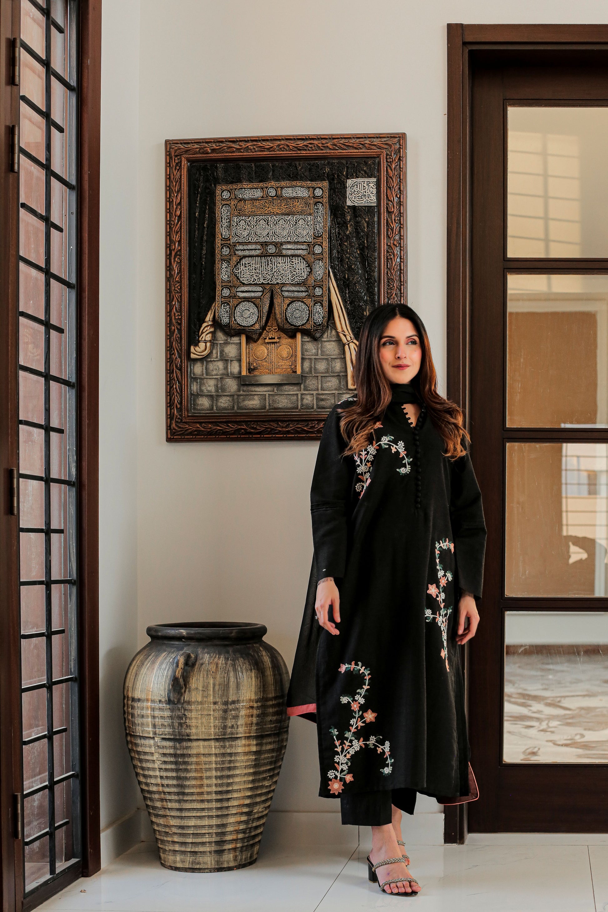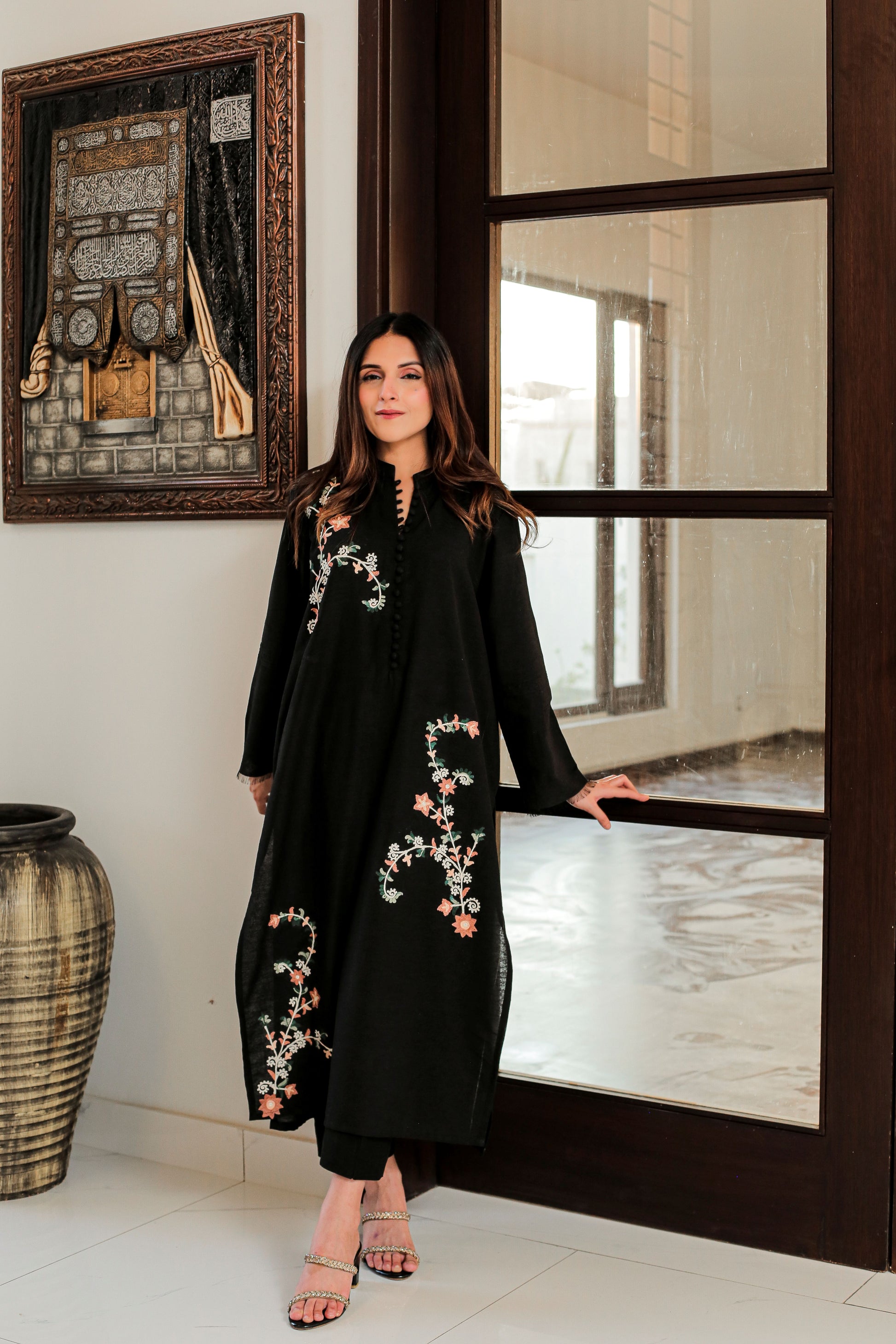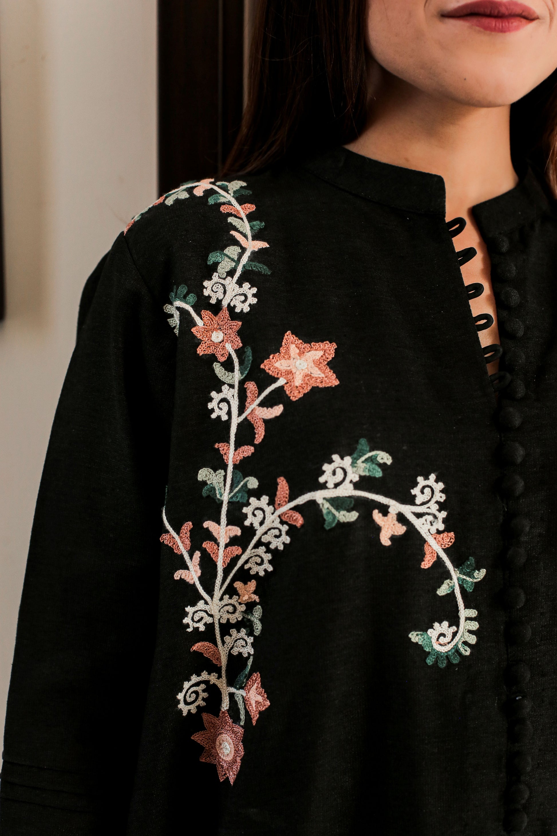 Black Bareeze cotton outfit featuring multicolored embroidery, paired with matching trousers. A chiffon dupatta with a delicate lace finish can be added.