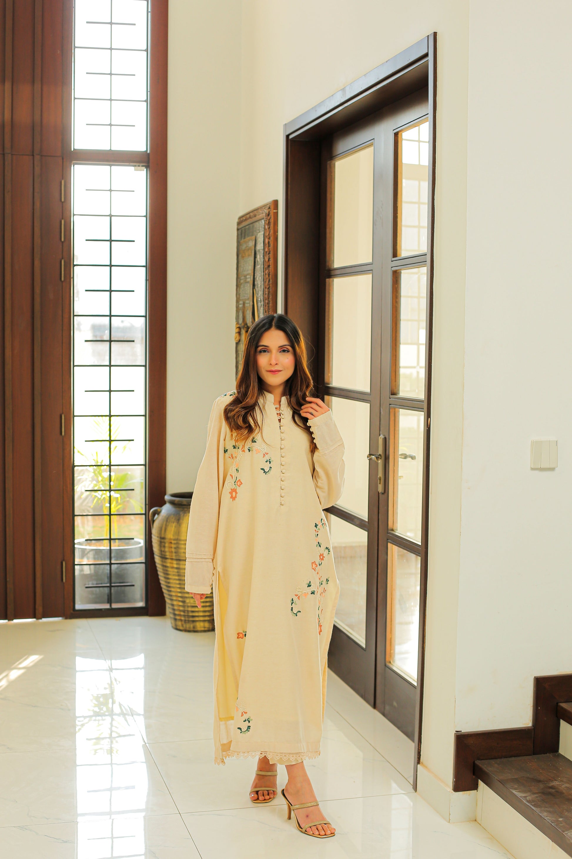 beige Bareeze cotton outfit featuring multicolored embroidery, paired with matching trousers. A chiffon dupatta with a delicate lace finish can be added.