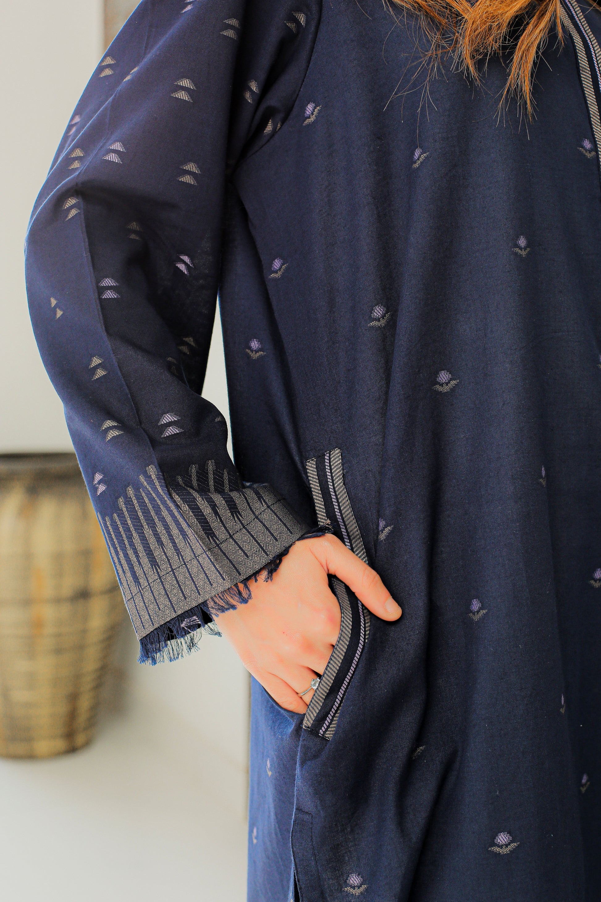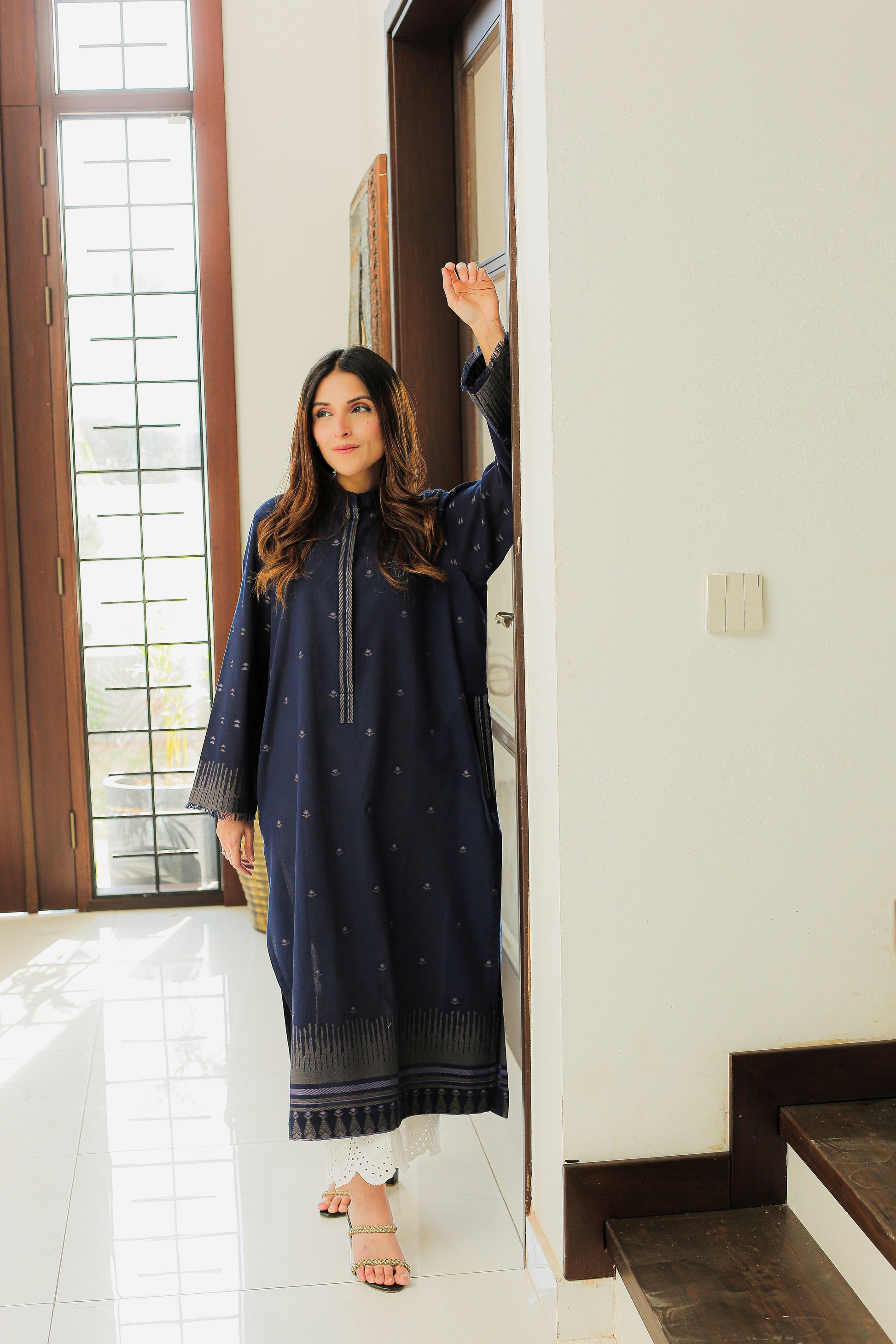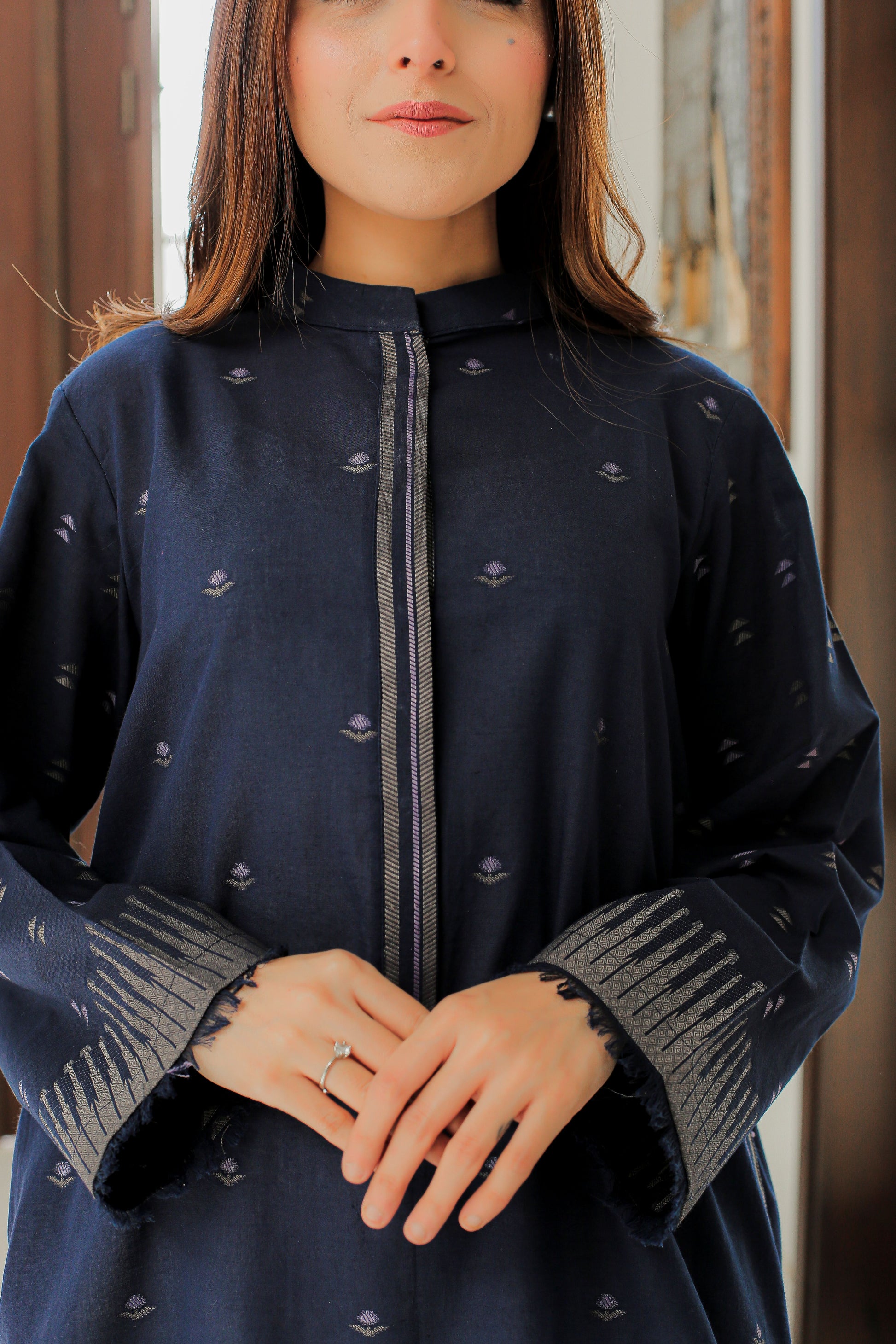 Deep blue jacquard cotton kurta with an elegant texture and refined finish.